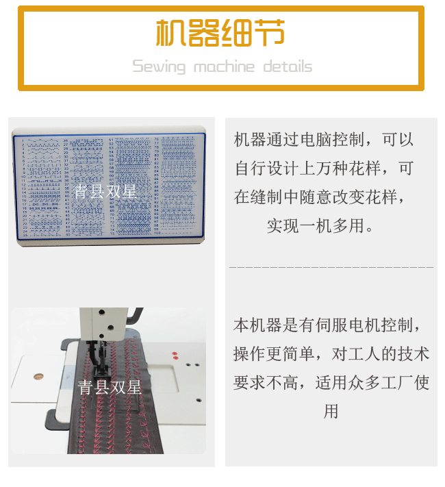 可以根據(jù)縫制工件的厚薄,縫制的線粗細(xì),更換機(jī)針的粗細(xì)號任意調(diào)節(jié)縫制,使得本機(jī)器的使用范圍更加廣泛。機(jī)器通過電腦控制,可以自行設(shè)計(jì)上萬種花樣,可在縫制中途隨意改變花樣,實(shí)現(xiàn)一機(jī)多用。由于本機(jī)器是有伺服電機(jī)控制,操作更簡單,對工人的技術(shù)要求不高,適用眾多工廠使用。